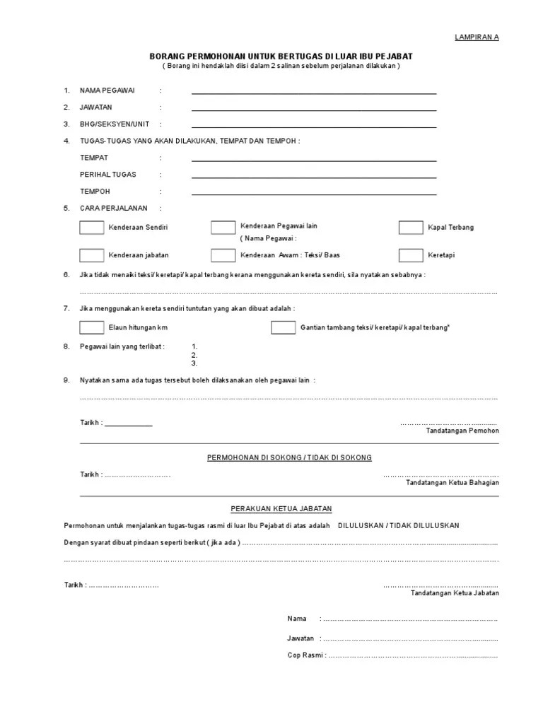 Lampiran A Borang Permohonan Bertugas Luar Ibu Pejabat from cdn.slidesharecdn.com Borang bertugas di luar pejabat. Penggunaan borang bertugas luar pejabat adalah diwajibkan kepada semua anggota lgm yang akan/diarah menjalankan tugas rasmi di luar ibu pejabat bagi mendapatkan kebenaran ketua jabatan/perkhidmatan terlebih dahulu sebelum meninggalkan pejabat, kecuali bagi menghadiri program latihan/kursus yang dibenarkan. Borang bertugas di luar pejabat. 25hb 26hb jun 2008 rabu khamis tarikh bertolak pergi. Borang permohonan bertugas di luar pejabat. Borang permohonan untuk bertugas di luar ibu pejabat atau luar negeri perlis.doc. Borang tuntutan perjalanan luar negeri borang menghadiri persidangan seminar dan lawatan rasmi ke luar negeri. For more information and source, see on this link :