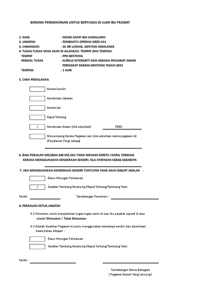 Borang bertugas di luar ibu pejabat borang bertugas di luar waktu pejabat surat arahan bertugas lebih masa surat tawaran / lantikan / penempatan / pertukaran geran kenderaan / surat kebenaran pemilik surat kelulusan bhg. Pegawai hendaklah sentiasa bersedia untuk menggantikan semula tempoh waktu bekerja (a) semenanjung malaysia rm30 semalam (b) sabah dan sarawak rm40 semalam (c) singapura dan brunei darussalam rm45 semalam. Sekiranya tempoh pegawai meninggalkan pejabat dalam waktu bekerja melebihi 4 jam atau separuh daripada waktu bekerja sehari yang ditetapkan pada hari tersebut, maka pegawai dikehendaki mengambil cuti rehat atau cuti lain yang berkelayakan. Borang permohonan untuk bertugas rasmi di luar pejabat / dan kebenaran membawa kenderaan sendiri (1pp wp 1.4) 1.