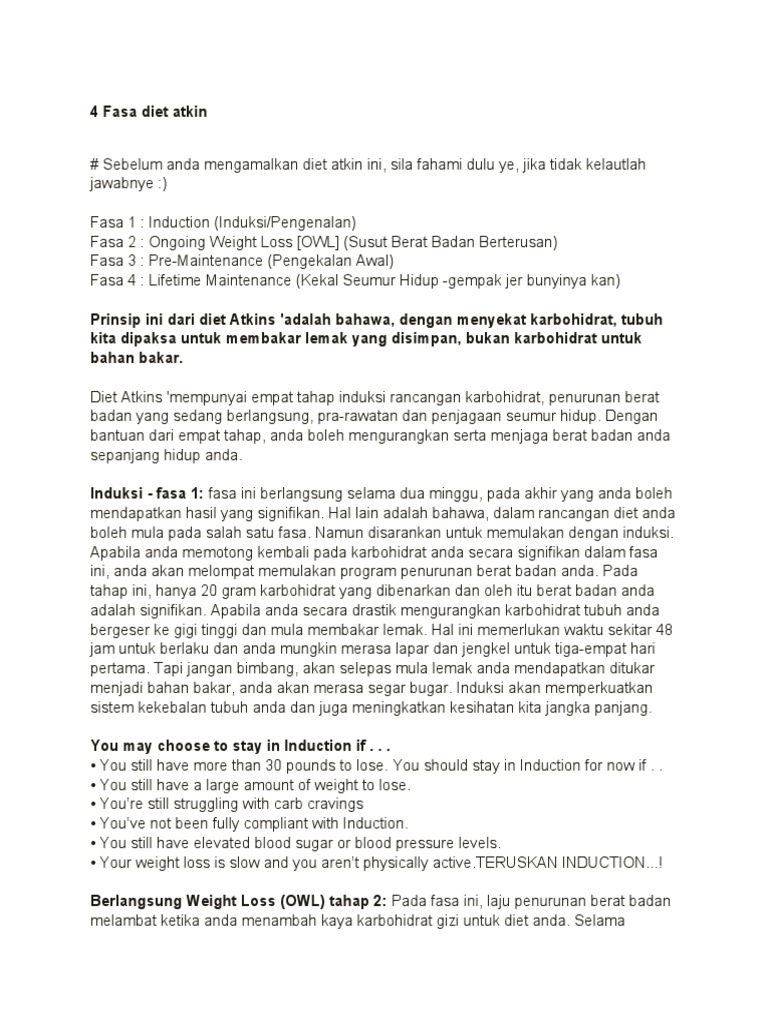 You are also advised to drink about 8 ounces of any kind of water per day or you can choose either herbal tea or coffee which is out of caffeine. Dalam fasa satu ni kita akan buat clean diet dalam 14 hari pertama iaitu makan makanan yang fresh bukan prosess food. The atkins diet is named for its creator, dr. The aim is to lose weight and improve health. Induction (induksi/pengenalan) download menu fasa 2 :