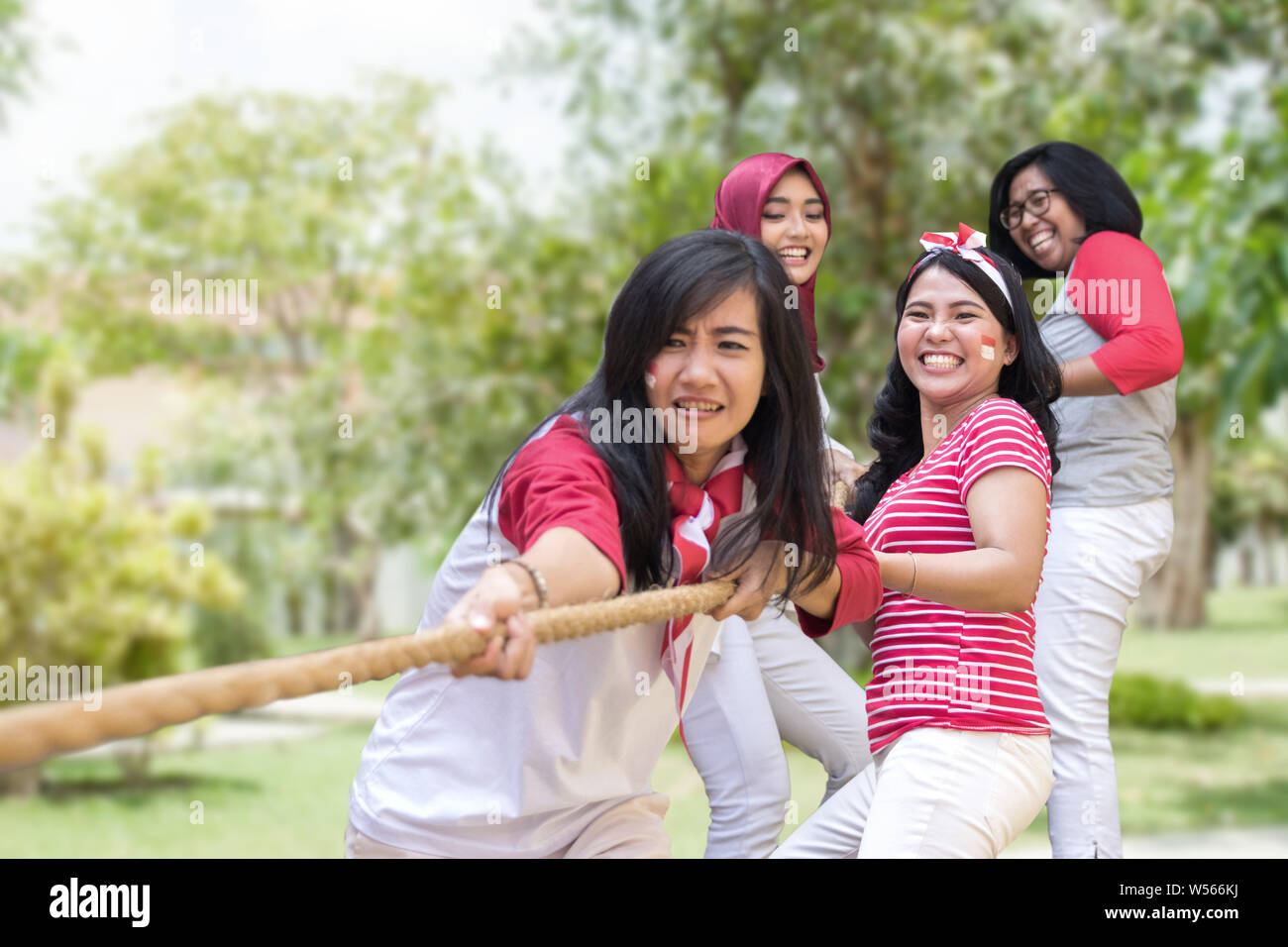 Dua regu bertanding dari dua sisi berlawanan dan semua peserta memegang erat seutas tali.